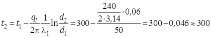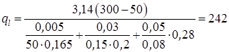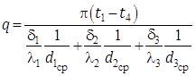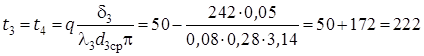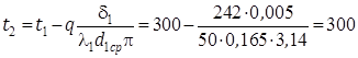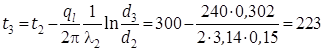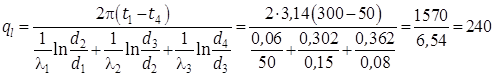 Задача 1. Паропровод диаметром dн = 0,17 м, dвн = 0,16 м покрыт двухслойной изоляцией. Толщина первого слоя изоляции d2 = 0,03 м, второго — d2 = 0,05 м. Теплопроводность трубы l1 = 50 Вт/(м·град); первого слоя изоляции — l2 = 0,15 Вт/(м·град); второго слоя изоляции — l = 0,08 Вт/(м·град). Температура внутренней поверхности трубы t1 = 300 °C, внешней поверхности изоляции — t4 = 50 °C. Определить теплопотери одного погонного метра трубопровода и температуры на поверхностях раздела.