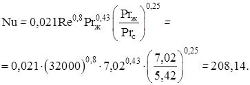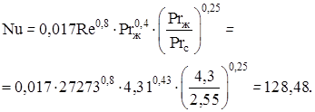 Из таблиц теплофизических параметров определяем при температуре теплоносителя tжср = 20 °C коэффициент теплопроводности воды lж = = 0,6 Вт/(м·град), коэффициент кинематической вязкости воды n = 1·106 м2/c, критерий Прандтля Pr = 7,02, а также значение критерия Прандтля воды при температуре стенки Prс = 5,42.