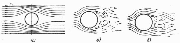 При больших значениях критерия Рейнольдса, которые характерны для практики, обтекание трубы сопровождается образованием в кормовой зоне вихрей, как это показано на рис. 13.8, б и 13.8, в. Как видно из рисунков, условия омывания фронтальной и кормовой частей совершено различны.