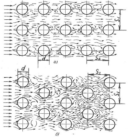 При обтекании потоком жидкости не одиночной трубы, а пучка труб процесс теплоотдачи усложняется. В технике применяется два основных типа трубных пучков — коридорный и шахматный