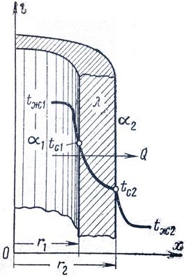 Рис. 16.3. Теплопередача через однослойную цилиндрическую стенку