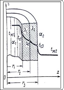 Рис. 16.4. Теплопередача через многослойную цилиндрическую стенку