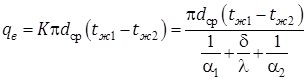 Так как формулы теплопередачи для труб довольно громоздки, при этом иногда вызывает затруднения определения величин натуральных логарифмов, то при проведении практических расчётов применяют некоторые упрощения. Вместо формул для определения линейного теплового потока для однослойной трубы (6.10) применяется формула для плоской поверхности, которая в применении к трубе длиной 1 м примет вид