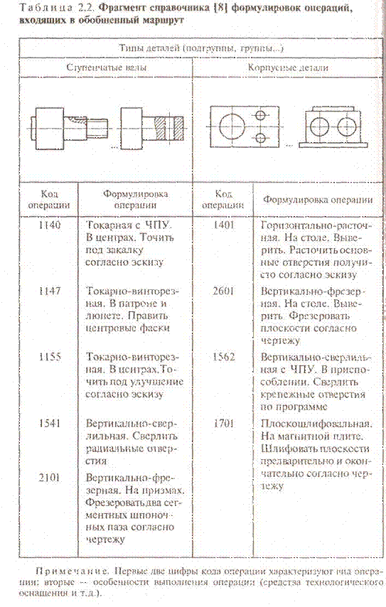 Обобщенный маршрут по сути — множество единичных маршрутных ТП, представленных своими кодами операций с указанием их наименования и сущности выполняемой в каждой операции работы. В результате анализа описаний операций единичных ТП изготовления деталей, обладающих сходными конструктивно-технологическими признаками, разрабатывают упорядоченные справочники формулировок операций, входящих в обобщенный маршрут (табл. 2.2).