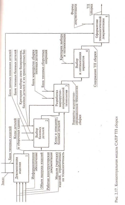 Важнейшей составляющей входной информации САПР ТП сборки (рис. 2.17) является модель предмета производства (изделия, сборочной единицы). Модель должна быть технологически опознаваема системой: для каждого ее элемента при необходимости должны определяться данные о точности размеров, формы и взаимного расположения поверхностей, граничащие (взаимодействующие) детали, характер взаимодействия, сведения о сопряжениях деталей (посадки), значения зазоров (натягов) в сопряжении и т.д.