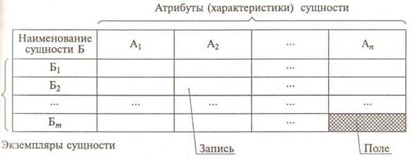 Конкретному экземпляру сущности (первый столбец) соответствует определенный набор (кортеж) значений атрибутов. Атрибуты могут быть представлены переменными различных типов. Пересечение строки и столбца, в котором размещают значение конкретного атрибута конкретного объекта, называют полем. При создании базы данных для размещения каждого атрибута отводят поле, соответствующее типу и ожидаемому предельному значению используемой переменной размера (формата). Строку, включающую наименование экземпляра сущности и кортеж значений его атрибутов, называют записью в базе данных. Фактографическая база данных — совокупность записей об экземплярах сущностей, характеризуемых заданными атрибутами.