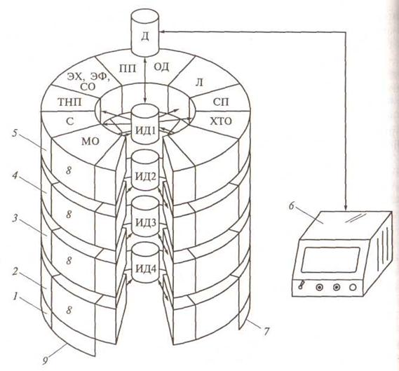 / — блок сборочного производства (С); 2 —5— уровни «производственный процесс», «технологический процесс», «технологический метод», «физические явления и эффекты» соответственно; 6 — терминал ввода-вывода; 7 — блок химико-термической обработки (ХТО); 8 — сегменты блока С; 9 — блок механической обработки (МО); ТНП — технология нанесения покрытий; ЭХ, ЭФ, СО — электрохимическая, электрофизическая и специальная обработки; ПП — прокатное производство; ОД — обработка давлением; Л — литейное и металлургическое производство; СП — сварочное производство; Д — диспетчерский программный модуль; ИД1—ИД4 — интерфейсно-диспетчерские модули