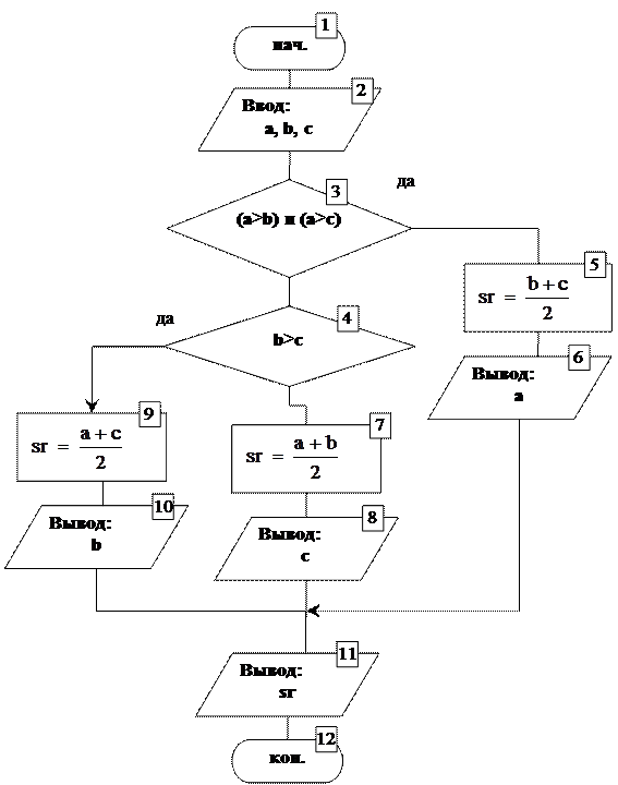 Для трёх различных входных значений количество разветвлений алгоритма также равно трём. После ввода данных (рис. 3, блок 2) в блоке 3 проверяется условие максимальности значения в переменной а. Если условие верно, т. е. из трёх значений а является максимальным, то управление передаётся блокам 5 и 6. В противном случае остаётся два варианта: либо максимальным является значение в переменной b, либо – в переменной c. Блок 4 выполняет такую проверку и, в зависимости от результата, передаёт управление либо на блок 9 и далее на блок 10, либо на блоки 7 и 8.