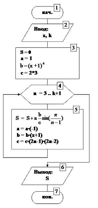 Дело в том, что в блоке 5 вначале выполняется вычисление следующего значения суммы (переменная S), а только затем, с помощью составленных ранее рекуррентных выражений, вычисляются следующие значения переменных a, b и c.