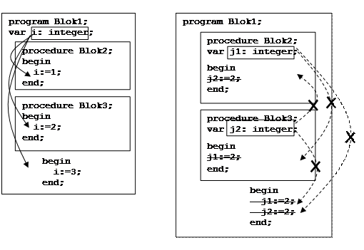 Область действия идентификатора распространяется от их места его описания в тексте до конца текущего блока, включая все блоки, входящие в текущий блок. Так переменная i, описанная в основной программе (рис. 23), будет видна и в самой программе, и в процедурах Blok2 и Blok3.