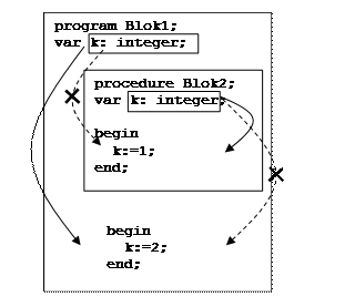 Рассмотрим следующую ситуацию. Допустим, что в программе Blok1 вложен блок процедуры Blok2. Если в обоих блоках имеются описания переменных с одинаковым идентификатором, например, k, то в блоке Blok1 имеется доступ только к идентификатору k, который в нем описан, и аналогично внутри блока Blok2 имеется доступ только к идентификатору k, описание которого он содержит (рис. 24).