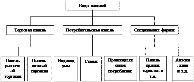 | Панель | Повторяющийся сбор данных у одной группы через равные промежутки времени | Торговая, потребительская, специальная | Постоянное отслеживание торговых запасов в группе магазинов | Выявление развития во времени. Смертность панели, эффект панели | |