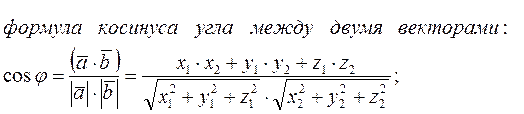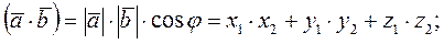 признак перпендикулярности: x1∙x2 + y1∙y2 + z1∙z2 = 0;