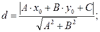 расстояние от точки M0(x0; y0) до прямой A∙x + B∙y + C = 0