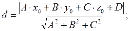 расстояние от точки M0(x0; y0; z0) до плоскости A∙x + B∙y + C∙z + D = 0