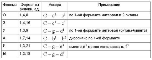 С самого начала в структуру нашего искусственного языка заложено близкое родство с музыкой. Ниже представлена таблица, из которой явствуют те закономерности, что послужат обоснованием многих из последующих рассуждений. Если переходы, переливы тонов речи во времени (переходы, превращения состояний объекта) рождают мелодию (причем стандартные наборы тонов, переходящих друг в друга носят в музыке титулы «аккордов арпеджио» – аккордов перебором струн, например), то аналогом аккордов иного типа, аккордов гармонических, служат гласные фонемы языка.