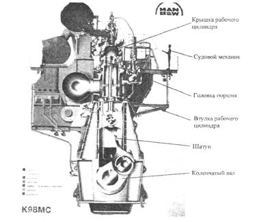 Рис. 1.1. Главный двигатель современного морского судна мод MANB&W K98MC производства фирмы MAN - BURMEISTER&WEIN и его основные элементы. Цилиндровая мощность - до 5270 кВт, число цилиндров — 6...18, диаметр головки поршня — 980 мм, ход поршня - 2260 мм