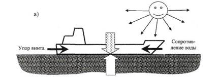 Вес судна уравновешивается равномерно распределенной по днищу силой Архимеда (т.н. "силой поддержания"), вследствие чего корпус судна практически не испытывает деформаций, а сопротивление воды компенсируется силой упора винта, создаваемой внутренним потоком энергии (см. рис. 1.4). Таким образом, в данной ситуации корпус судна находится в условиях действия статических нагрузок, наиболее благоприятных для его материала.