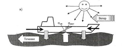 К внешним относятся энергия солнца, ветра и воды (рис. 1.3). При плавании по "тихой воде" (рис. 1.3, а) к числу внешних потоков относятся поток химической энергии, вызывающий коррозию корпуса судна и расположенных на палубе СТС, а также т.н. "солнечный ветер" - давление, создаваемое идущим от Солнца потоком плазмы.