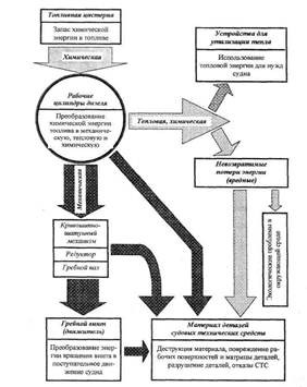 Воздействие внутренних потоков гораздо сложнее и многообразнее. Рассмотрим его важнейшие моменты применительно к главному двигателю, основным назначением которого является преодоление действия внешних энергетических потоков и обеспечение движения судна (рис. 1.5).
