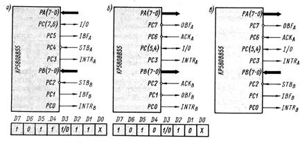 Пример конфигурации ППИ в режиме 1 и соответствующее ему управляющее слово для ввода по каналам А, В, показан на рис. 3.5, а на рис. 3.5, б - для вывода. Не используемые для передачи управляющих сигналов линии РС7, РС 6 (рис. 3.5, а) и РС5, РС 4 (рис. 3.5, б) могут быть запрограммированы на ввод (D3=1) или вывод (D3=0). На рис. 3.5.в. приведен вариант конфигурации ППИ в режиме 1 для вывода информации по каналу А и ввода по каналу В. Управляющее слово этого варианта имеет вид 1010D311 X, где D3 определяет работу линий РС 5, РС 4 на ввод или вывод.