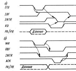 Временные диаграммы работы ППИ в режиме 1 при вводе и выводе информации представлены, соответственно на рис. 3.6, а и 3.6, б.