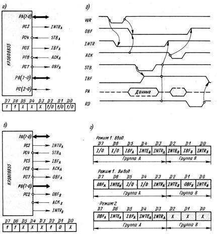 Один из возможных вариантов комбинированного режима работы ППИ, в котором канал А запрограммирован на режим 2, а канал В-на вывод в режиме 1 показан на рис. 3.7,в
