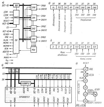 БИС программируемого контроллера прямого доступа к памяти КР580ВТ57 предназначена для организации высокоскоростного обмена данными между памятью и внешними устройствами, выполняемого по инициативе внешнего устройства (рис. 3.8). Контроллер прямого доступа к памяти (КПДП) генерирует управляющие сигналы, необходимые для организации обмена. КПДП содержит четыре канала прямого доступа, каждый из которых обеспечивает передачу блока данных размером от 0 до 16К байт с произвольным начальным адресом в диапазоне от 0 до 64К байт (рис. 3.8,а)
