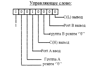 Программирование микросхемы. Составляется управляющее слово, задающее текущую конфигурацию микросхемы (рис. 4.2) значение разрядов указывают режим работы и направление передачи информации. В шестнадцатиричной системе счисления 10010000 В = 90 Н. Управляющее слово в начале программы записывается в регистр управления (адрес 93).