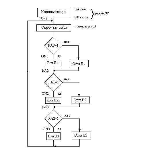 РА0 = 1 - проверка состояния датчика SA1, состояние разряда РА0: если есть логическая 1 то датчик включен (ДА), если логический 0 датчик выключен (НЕТ). Здесь алгоритм разветвляется: в случае ДА - переход к вкл.U1, если НЕТ - переход откл.U1;