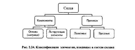 В состав сплава входят компоненты и примеси (рис. 2.24). Компоненты - это вещества, которые введены в состав сплава специально, с целью получения необходимых свойств. Примеси попадают в сплав в ходе его получения случайно, обычно при выплавке27. Их подразделяют на полезные и вредные.