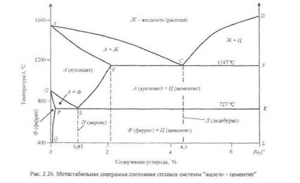 Таким образом, на практике используются только материалы с содержанием углерода до 6,67%. Оно отвечает цементиту - химсоединению Fe3C, что позволяет сузить концентрационную ось и говорить о диаграмме состояния "железо - цементит" (рис. 2.26).