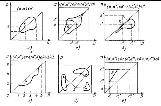 Эквивалентностью называется симметричное, рефлексивное, транзитивное отношение. Это отношение имеет большое значение при формализации процессов и явлений (рис. 2.3, а). В математике оно связано с понятием разбиения множеств на классы. Если отношение R есть эквивалентность на множестве Dj, то элементы d и d' относятся к одному классу Dj разбиений тогда и только тогда, когда (d, d')
