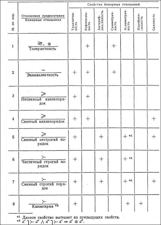 В зависимости от наличия дополнительных свойств у указанных отношений вводятся различные их градации, представленные в табл. 1. Отношения 2—8 в табл. 1 охарактеризованы как транзитивные, в общем случае они таковыми могут и не быть (например, если эти отношения выявлены в результате попарного сравнения). Транзитивность теряется в том случае, если ЛПР в процессе контрольных предъявлений оценивает объекты по разным целевым признакам. Отношение нестрогого предпочтения ^ является следствием нестрогого ранжирования элементов. В результате этого все множество предъявления элементов разбивается на различающиеся по предпочтительности классы, внутри которых элементы одинаковы по предпочтительности. Если каждый класс содержит только один элемент и проведено нестрогое ранжирование, то такое отношение есть связный нестрогий порядок. Если при этом ранжирование строгое, — связный строгий порядок (серия). Если в каждом классе более одного элемента, проведено строгое ранжирование между классами, но внутри класса элементы неразличимы (либо несравнимы, либо эквивалентны), то полученное отношение есть квазисерия. Любое частичное отношение отличается от связного тем, что классы элементов из множества предъявления нельзя полностью упорядочить по предпочтительности (это можно сделать лишь частично).