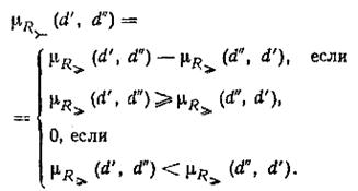 D значение функции принадлежности µR≥ (d', d") понимается как степень выполнения предпочтения: «элемент d' «не хуже» элемента d"». Равенство µR≥ (d', d") = 0 означает, что либо µR≥ (d",d') > 0 («элемент d" «не хуже» элемента d'»), либо — µR≥ (d", d') =0 (элементы d' и d" несравнимы между собой).