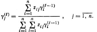 . Иногда в качестве критерия останова используют условие t = ttp (обычно ttp выбирают в диапазоне 3—5, что обусловлено быстрой сходимостью процесса). Содержательный смысл алгоритма состоит в том, что на первой итерации (t = 1) подсчитывают отношение суммы «голосов», поданных за кандидата с номером i, к общему числу всех «голосов» (сумма единиц в матрице смежности). На последующих итерациях (t > 1) голоса «взвешиваются» коэффициентами компетентности кандидатов