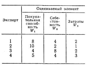 Пример 2.5. Четыре эксперта, оценивая относительную важность покупательной способности, себестоимости и затрат в проблеме повышения рентабельности предприятия (см. пример 2.3) в десятибалльной шкале, дали следующие оценки: