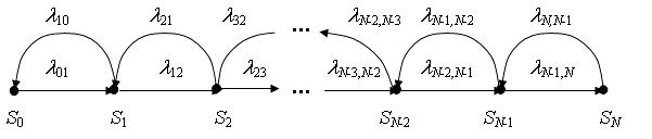 Из сказанного следует, что однофазной СМО соответствует граф состояний (рис. 6.3), вершины которого (S 0, S 1, S 2,...) образуют последовательную цепочку, и любые две соседние вершины соединены двумя встречно-направленными дугами, а процесс ее функционирования представляет собой так называемый процесс «гибели и размножения» (уменьшение и увеличение числа заявок).