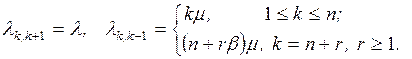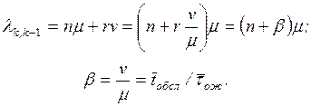 Если число заявок в системе k<n, то lk,k- 1= km.. Если в очереди имеется r заявок (k=n+r), то переход из состояния Sk в состояние Sk- 1 осуществляется или в результате завершения обслуживания одной из п заявок, или в результате ухода из очереди одной из r заявок, то есть