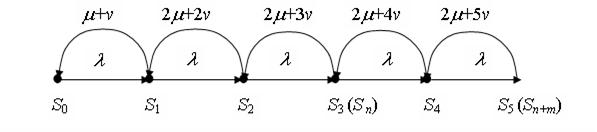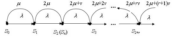 СМО с ограниченным временем ожидания характеризуется тем, что уменьшение числа заявок в ней происходит как в результате завершения обслуживания одной из заявок, так и в результате ухода заявок из очереди с интенсивностью v.