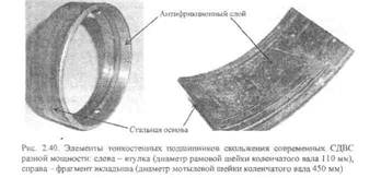 Перечень сочетаемых с ней антифрикционных материалов более разнообразен: баббиты, бронзы, чугуны, резины и пр. Часто, в целях экономии, они наносится тонким слоем на стальную подложку, образуя с ней одно целое (рис. 2.40). Такая композитная деталь проста конструктивно, изнашивается быстрее и во время ремонта заменяется. Например, наработка на отказ головки поршня малооборотных судовых дизелей в 5...7 раз больше наработки поршневых колец.