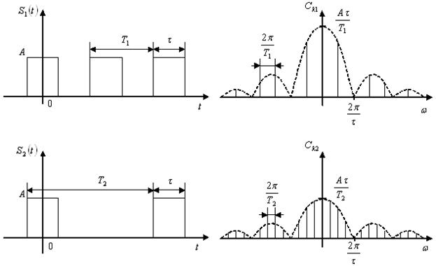 На качественном уровне проиллюстрируем переход от ряда Фурье к преобразованию Фурье. Представим себе периодическую последовательность импульсов и сформулируем ряд Фурье для нее. Затем увеличим период повторения импульсов