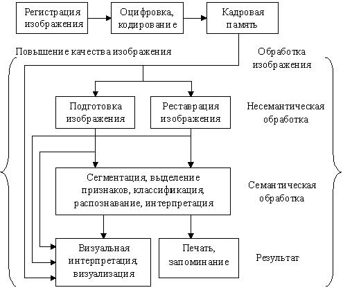 Различают обработку изображений, предназначенных для зрительного восприятия (отображение информации), и обработку в устройствах автоматического анализа. В последнем случае на первый план выходят задачи выделения признаков, формирования данных о количественных характеристиках и др. Обработку изображения, проводимую с целью улучшения его зрительного восприятия, иллюстрирует рис.1.