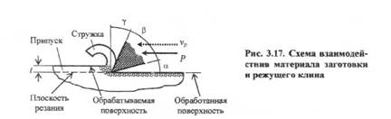 Несмотря на большое разнообразие видов обработки резанием, все они могут быть сведены к взаимодействию материала заготовки и режущего клина (рис. 3.17), сопровождающемуся сложными физическими процессами.
