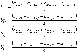 В первой, как легко догадаться, будет храниться уменьшенная копия изображения. Во второй – усредненные разности пар значений пикселов по горизонтали. В третьей – усредненные разности пар значений пикселов по вертикали. В четвертой – усредненные разности значений пикселов по диагонали. По аналогии с двумерным случаем мы можем повторить наше преобразование и получить вместо первой матрицы 4 матрицы размером
