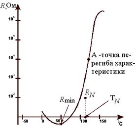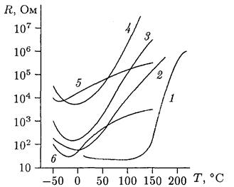 Рисунок 6.4–Зависимости сопротивления позисторных элементов от температуры: