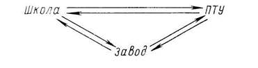 Однако говорить о преемственности можно лишь в том случае, когда эти три звена действуют не только последовательно, но и совместно. ПТУ и производство, решая свойственные им задачи профессиональной ориентации, не должны замыкаться только в стенах своего учебного заведения или завода, а оказывать помощь в работе школы. А это, в свою очередь, обеспечит комплектование училищ и производств более подготовленными юношами и девушками с точки зрения их способностей и моральной подготовленности к труду. Эту взаимосвязь можно отразить в следующей схеме: