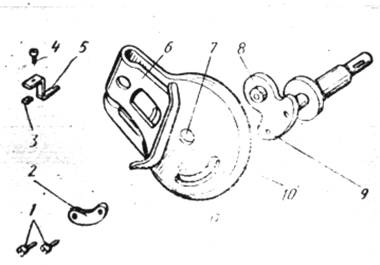 Нитепритягиватель(10) отверстием(7) надет на выступ(8) пальца кривошипа и через прокладку(2) крепится к приливу кривошипа(9) двумя винтами(І) на фронтальной доске. Винтом(4) и гайкой(З) крепится нож(5), для обрезки нитки при обрыве, чтобы устранить наматывание её на кулачок(б) нитепритягивателя.