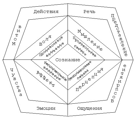 Функциональная структура психики человека (в психологических категориях), представленная в радиально круговой системе координат (по В. А. Ганзену):