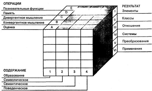 К факторным моделям также относится концепция интеллекта Гилфорда. Согласно ей, интеллект — это многомерное явление, которое может быть оценено по трем направлениям: содержанию, продукту и характеру. Умственная операция, включенная в интеллект, по характеру может быть следующей: оценивание, синтез, анализ, запоминание, познание. По продукту умственная операция может быть: единицей, классом, отношением, системой, трансформацией, рассуждением. По содержанию умственная операция может представлять собой действие с объектами, символами, преобразование смыслов, поведение. Всего модель интеллекта Гилфорда включает 120 различных интеллектуальных процессов. Все они сводятся к 15 факторам: пять операций, четыре вида содержания, шесть типов продуктов мыслительной деятельности: